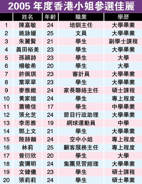 中新網(wǎng)6月7日電 據(jù)香港媒體報道,《2005年度香港小姐競選》二十位候選佳麗將于下周一起程到南亞海嘯災(zāi)區(qū)探訪,昨日一班佳麗經(jīng)過大會連日來“改頭換面”,首次正式會見傳媒。今屆參選的佳麗學(xué)歷俱十分高,大部分佳麗皆擁有大學(xué)程度,其中9號麥雅致、19號文健儀和20號張莉莉更持有碩士學(xué)位。不過佳麗們的平均年齡亦直線上升,有九位佳麗年齡更在24歲以上,接近參選的年齡上限。