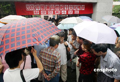 六月七日,二○○五全國(guó)高考在各地同時(shí)拉開(kāi)帷幕,今年全國(guó)考生人數(shù)為八百六十七萬(wàn),上海有十一萬(wàn)考生今起走進(jìn)考場(chǎng),一些家長(zhǎng)等在考場(chǎng)外冒雨“陪考”。作者:湯彥俊