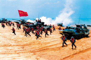 午后,一天中最熱的時(shí)候,趁著海水漲潮,官兵開始了游泳訓(xùn)練。記者看到,在正面寬約5公里的海灘上,全旅官兵長龍似的排開,露出一片黝黑的鋼鐵般的脊背。隨著一顆信號彈升空,數(shù)千名官兵同時(shí)下海,場面很是壯觀。官兵們奮力劃水,漸游漸遠(yuǎn),變成波峰浪谷中若隱若現(xiàn)的一個(gè)個(gè)黑點(diǎn)。該旅的游泳訓(xùn)練,上至旅長、政委,下至駕駛員、炊事兵,全旅官兵都要下海。記者在海邊看到,被譽(yù)為“兩棲作戰(zhàn)先鋒”的裝甲團(tuán)團(tuán)長陳昌鋒帶頭下海,身上被水母蜇出大片大片的紅疹。