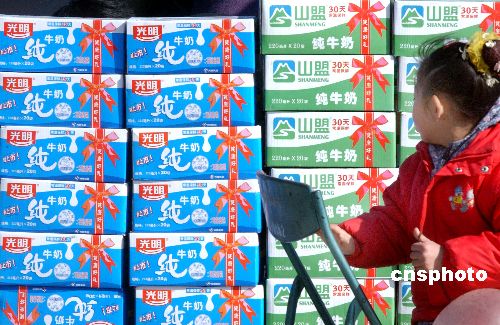 | 河南媒體近日報道了鄭州光明山盟乳業(yè)有限公司“變質(zhì)光明牛奶返廠加工再銷售”一事。對此,鄭州光明山盟的控股方——光明乳業(yè)股份有限公司當(dāng)日發(fā)布了“誠告消費(fèi)者書”,稱“鄭州光明山盟從來沒有做過‘將變質(zhì)牛奶返廠加工再銷售’的行為”,但也坦承光明在管理上存在疏漏。圖為2005年3月13日鄭州街頭促銷的光明純牛奶和光明山盟純牛奶。作者:馬健