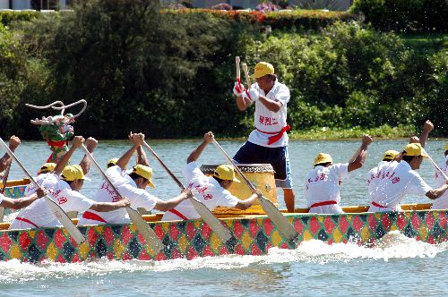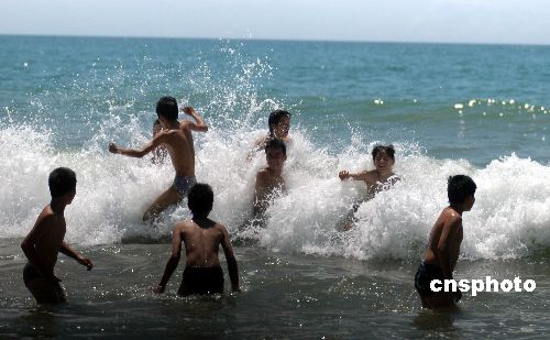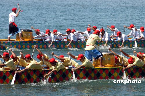 6月11日,海南博鰲16支龍舟隊冒著烈日在萬泉河入?谂e行精彩激烈的龍舟大賽,慶祝傳統(tǒng)佳節(jié)端午節(jié)。在博鰲海濱,不少村民攜兒帶女下海游泳,在端午節(jié)這一天俗稱洗龍水祈平安。作者:蒙鐘德