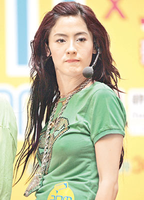 昨天柏芝穿上綠色T恤襯低腰褲作hip hop打扮,跳舞時卻配上“特別效果”,胸前出現(xiàn)“凸點”現(xiàn)象之余,黑色內(nèi)褲邊也隨著拍子頻頻曝光。柏芝更是語出驚人,在與fans跳舞時,她竟向fans說:“你用下面(下半身)頂住記者就得!笔植晃。當她唱《新聞女王》時,有人假扮狗仔隊偷拍她,柏芝就用屁股把他頂開。