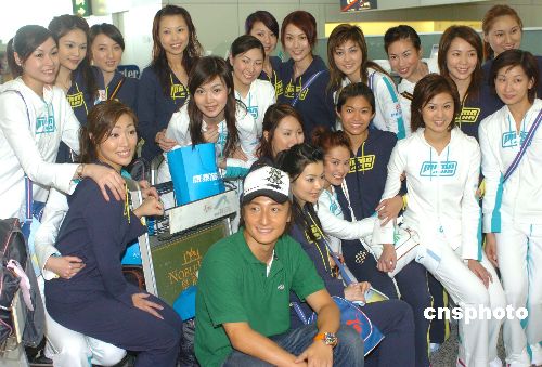 香港歌星方力申13日“率領(lǐng)”20位候選港姐乘坐斯里蘭卡航空公司航班奔赴馬爾代夫﹑斯里蘭卡﹑泰國拍攝外景﹐在香港機場與候選港姐合影。作者:趙振清