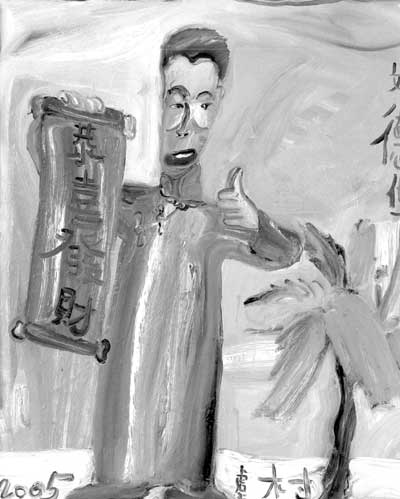 “周潤(rùn)發(fā)”看上去竟然像個(gè)日本人;“姚明”的腦袋和身子幾乎一樣長(zhǎng);“容祖兒”一只眼睛大,一只眼睛小,張著一張血紅色、與面部不相稱的大嘴;“劉德華”的腦袋是歪的。而所有人物的比例完全失調(diào),表現(xiàn)的筆觸完全放在了臉部,身子、腿完全像是嫁接的。
