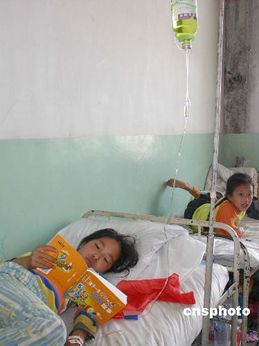 截至六月十四日,在黑龍江沙蘭鎮(zhèn)洪災(zāi)中受傷入院的十七名學(xué)生已基本康復(fù)。圖為一名學(xué)生邊輸液邊閱讀故事書。作者:吳兆飛
