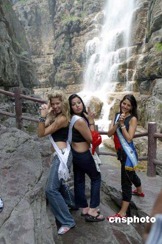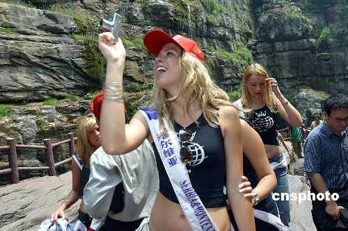 圖:國(guó)際“旅游小姐”在河南云臺(tái)山天瀑下