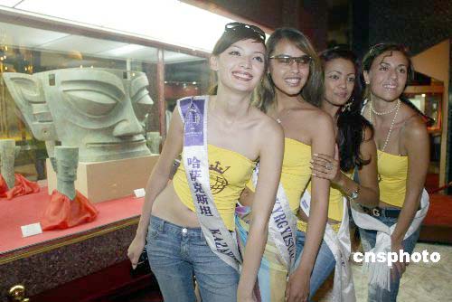六月十五日,二○○五國際旅游小姐冠軍總決賽的來自七十五個(gè)國家和地區(qū)的旅游形象大使,來到四川省廣漢市,參加二○○五中國四川三星堆國際旅游文化節(jié)暨二○○五國際旅游小姐最具魅力小姐冠軍大賽決賽,各國參賽佳麗在參觀三星堆博物館時(shí),與著名的“三星堆面具”比拼美麗。作者:盛佳鵬