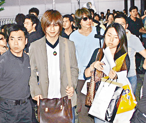 當言、周二人出閘,fans欣喜若狂,場面一發(fā)不可收拾,三十多名保安、十多名警察嚴陣防亂,F(xiàn)場所見,明顯以言承旭fans的聲勢比周渝民強勁得多,難怪言承旭不時風騷地向群眾揮手,反觀周渝民則頭耷耷,無厘神氣。最后二人在保安筑成人墻護送下登車離去。