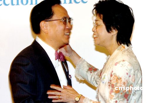 曾蔭權在16日晚的記者會上與夫人相擁祝賀。