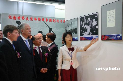 六月十八日,俄羅斯國家杜馬主席格雷茲洛夫出席了重慶市直轄八周年紀(jì)念活動和《紀(jì)念二戰(zhàn)勝利六十周年圖片展》開幕式。圖為重慶中國三峽博物館《紀(jì)念二戰(zhàn)勝利六十周年圖片展》展廳內(nèi),格雷茲洛夫(左二)認(rèn)真傾聽講解員解說。作者:郭晉嘉