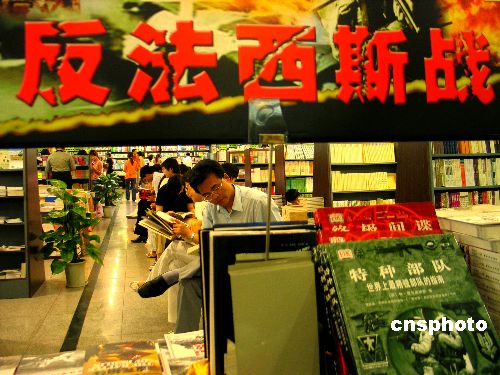 6月18日,南京某書城為紀(jì)念中國(guó)抗日戰(zhàn)爭(zhēng)暨世界反法西斯戰(zhàn)爭(zhēng)勝利60周年,在店堂內(nèi)設(shè)立了反法西斯戰(zhàn)爭(zhēng)主題書展,受到讀者歡迎,每天都吸引百余位讀者。作者:鐘山