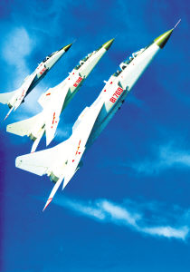 1999年10月1日,“飛豹”以壯美的雄姿第一次在全國人民面前莊嚴亮相:6機箭形編隊以“不偏一米、不差一秒”的驕人成績準確通過天安門上空,接受了黨和人民的檢閱,創(chuàng)下了參閱機型最新、改裝時間最短、飛行密度最大、編隊難度最高、閱兵航程最遠5項記錄。