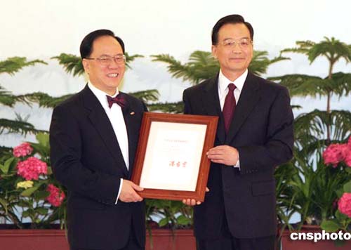 圖:溫家寶向曾蔭權(quán)頒發(fā)任命書