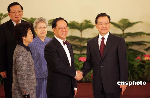 八時(shí)五十八分許,身著深色西裝、深紅色領(lǐng)結(jié)的香港特別行政區(qū)行政長(zhǎng)官曾蔭權(quán)攜夫人步入香港廳。同樣著深色西裝、系深紅色領(lǐng)帶的國(guó)務(wù)院總理溫家寶與他緊緊握手。