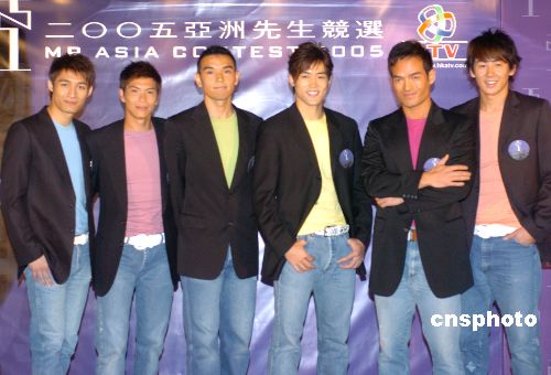 參加《2005亞洲先生競選》的中國香港賽區(qū)的三位參賽者(左)與中國國內(nèi)賽區(qū)的三位參賽者(右)24日在香港亮相。作者:趙振清