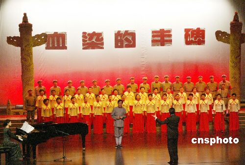 六月二十六日,為紀(jì)念中國(guó)工農(nóng)紅軍長(zhǎng)征勝利七十周年和中國(guó)人民抗日戰(zhàn)爭(zhēng)勝利六十周年,曾參加過戰(zhàn)爭(zhēng)的老紅軍、新四軍、八路軍匯聚在北京解放軍歌劇院,參加在這里舉行的“血染的豐碑”紀(jì)念活動(dòng)。圖為北京新四軍研究會(huì)藝術(shù)團(tuán)、寶塔山合唱團(tuán)以及哈爾濱軍工校友合唱團(tuán)在活動(dòng)上演唱?dú)v史歌曲。作者:錢興強(qiáng)