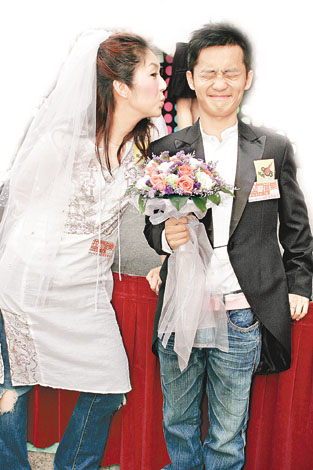 中新網6月28日電 據(jù)香港媒體報道,楊千嬅和林一峰昨日到銅鑼灣,出席《拉闊音樂會》的露天記者會,兩人以新郎新娘造型出現(xiàn)扮結婚,他們更即場作狀簽字和交換戒指,但簽字時突然下雨,搞到兩人十分狼狽,千嬅笑言連老天都反對兩人結婚,當千嬅讀誓詞時又忍不住笑,最后她把花球拋給林一峰。