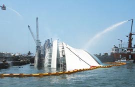 30日凌晨零時(shí)許,船體又見(jiàn)火舌,黑夜中大火吞噬船只,郵輪傾斜漸趨嚴(yán)重,凌晨4時(shí)30分左右燒得焦黑的煙囪撞擊在碼頭上,船身呈90度傾斜,右側(cè)整個(gè)坐在海床上。