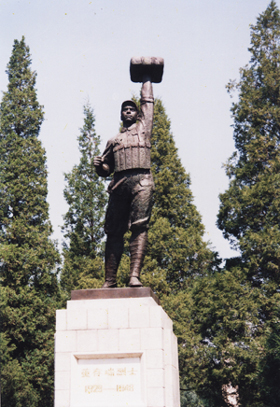 在亭、館間兩條對角線交點上,是翠柏簇?fù)淼亩嫒鹆沂克芟。英雄身著軍裝,昂首挺胸,左手高擎炸藥包,右手緊握拉開的導(dǎo)火索,再現(xiàn)了董存瑞視死如歸的英雄氣概。