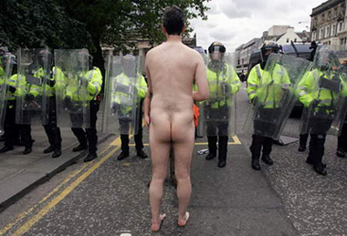 中新社7月5日電 2005年7月4日,在蘇格蘭首府愛丁堡中部發(fā)生的一場小沖突中,一名裸體男子站在防暴警察的隊伍前面。人們抗議兩天后在格倫伊格爾斯舉行的8國峰會,防暴警察用警棍鎮(zhèn)壓騷亂。(春風(fēng))