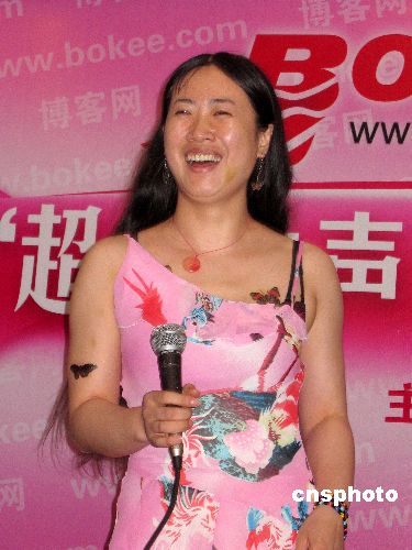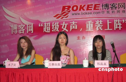 七月五日,由博客網(wǎng)主辦的“超級女聲重裝上陣”活動(dòng)新聞發(fā)布會在北京舉行。備受中國內(nèi)地網(wǎng)民關(guān)注的歌手韓真真(圖右1)全程代言此次比賽!熬W(wǎng)絡(luò)紅人”木子美、芙蓉姐姐、流氓燕、竹影青瞳等作為嘉賓進(jìn)行全程賽況點(diǎn)評。