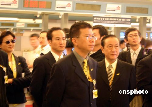 七月六日上午,新黨主席郁慕明(右二)與該黨“民族之旅”訪問團成員在臺北桃園機場等候辦理登機手續(xù)。郁慕明在行前表示,此行主要是紀念抗戰(zhàn)勝利六十周年,進行兩岸間的溝通協(xié)調(diào),與國、親大陸訪問團不做比較,而是互補。作者:劉舒凌