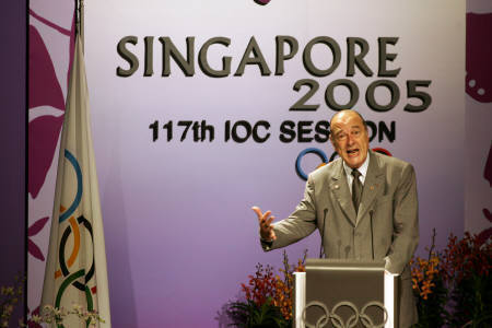 7月6日,法國總統(tǒng)希拉克親自在新加坡舉行的國際奧委會(IOC)第117屆大會中,為巴黎發(fā)表申奧陳述。巴黎、倫敦、紐約、馬德里和莫斯科共同角逐2012年夏季奧運會主辦權,IOC將在6日稍晚在新加坡投票選出主辦城市。圖據路透社