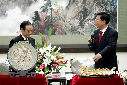 中共中央政治局委員、中共廣東省委書記張德江七月六日在廣州會見并宴請由新黨主席郁慕明率領(lǐng)的臺灣“新黨紀(jì)念抗戰(zhàn)勝利六十周年大陸訪問團(tuán)”。圖為張德江與郁慕明互贈禮品。作者:毛建軍