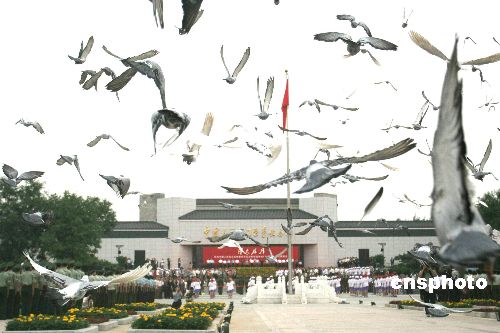 七月七日,“偉大勝利——紀(jì)念中國人民抗日戰(zhàn)爭暨世界反法西斯戰(zhàn)爭勝利六十周年大型主題展覽”在北京中國人民抗日戰(zhàn)爭紀(jì)念館正式開展。展覽共選用文物八百余件、照片六百余張、圖表近四十件,有大量的歷史資料、其中的一百四十一件文物為首次披露。圖為開展儀式上和平鴿飛翔。作者:盛佳鵬