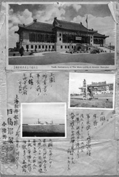 在一塊硬紙板上,這位日軍軍官特意將上海市市政府大樓被日軍轟炸前后作了比較。在被炸毀的上海市政府大樓照片中,還顯示出一塊寫有“上海神社建設(shè)地”的牌子。這幅照片的圖片說(shuō)明注明當(dāng)時(shí)日軍有在上海市府前建靖國(guó)神社的企圖。在同一紙板后面,所貼的照片顯示了當(dāng)年上;疖囌颈徽У膽K狀。