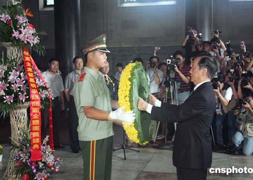 臺(tái)灣新黨主席郁慕明率領(lǐng)的臺(tái)灣新黨“民族之旅”訪問(wèn)團(tuán)七月八日在南京拜謁中山陵敬獻(xiàn)花圈。作者:毛建軍