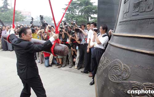 訪問團一行在紀(jì)念館的“悼念廣場”舉行祭奠儀式,悼念在侵華日軍南京大屠殺中遇難的三十萬同胞,并仔細參觀了紀(jì)念館。參觀結(jié)束后,郁慕明在紀(jì)念館揮毫寫下“毋忘國恥”四個大字,還撞響了“和平大鐘”。
