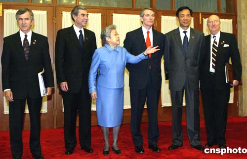 中國(guó)國(guó)務(wù)院副總理吳儀(左三)、中國(guó)商務(wù)部部長(zhǎng)薄熙來(lái)(右二)與美國(guó)商務(wù)部長(zhǎng)古鐵雷斯(左二)、美國(guó)貿(mào)易代表波特曼(右三)、美國(guó)農(nóng)業(yè)部長(zhǎng)約翰斯(左一)、美國(guó)駐華大使雷德(右一)在會(huì)前合影。作者:廖文靜