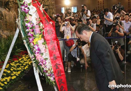 隨后郁慕明一行來(lái)到位于宛平城北側(cè)的“中國(guó)人民抗日戰(zhàn)爭(zhēng)紀(jì)念館”。在序廳里,郁慕明向抗日英烈們敬獻(xiàn)了花圈,并默哀致敬。隨后,訪問(wèn)團(tuán)參觀了“偉大勝利——紀(jì)念中國(guó)人民抗日戰(zhàn)爭(zhēng)暨世界反法西斯戰(zhàn)爭(zhēng)勝利六十周年大型主題展覽”。展覽分民族危急救亡興起、國(guó)共合作共赴國(guó)難、中流砥柱抗戰(zhàn)燈塔等八個(gè)部分。記者注意到,郁慕明在國(guó)共合作共赴國(guó)難以及臺(tái)港澳同胞抗日部分逗留時(shí)間最長(zhǎng)。