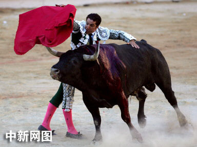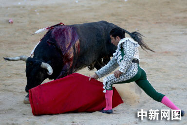 圖:西班牙潘普洛納奔牛節(jié)上舉行斗牛表演