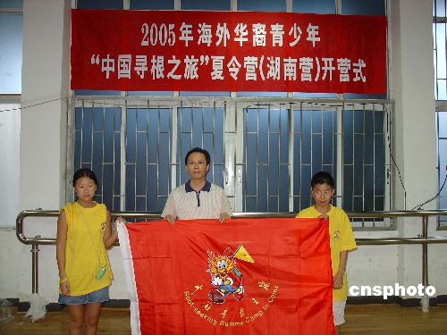 7月11日,2005年海外華裔青少年“中國尋根之旅”夏令營在長沙舉行開營式。來自美國和丹麥的華裔青少年將在這里進(jìn)行為期9天的學(xué)習(xí)和參觀活動(dòng)。圖為湖南省外僑辦向營員代表頒授了《中國尋根之旅夏令營》營旗。作者:鄧霞