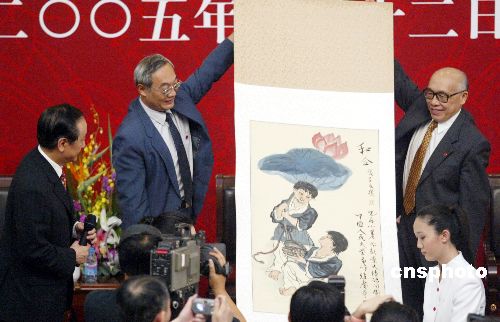 二、一幅名為“和合”的中國畫。“和合二仙”是中國民間傳說之神,有“和諧合好”,“婚姻和合”,“家人和合”等豐富含義,蘊(yùn)含著中國哲學(xué)的核心思想。“和合”還有“回家”之意,象征臺灣盡早回歸,實(shí)現(xiàn)統(tǒng)一。