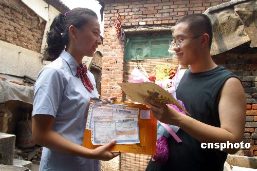 7月15日上午,家住濟(jì)南市經(jīng)四路131號小巷平房的高考考生唐寅,收到了濟(jì)南市郵政速遞局送到的中央民族大學(xué)錄取通知書,同時(shí)速遞員還送給他一束鮮花表示祝賀。據(jù)山東省郵政部門介紹,這是山東省考生收到的第一份05年錄取通知書。據(jù)濟(jì)南郵政速遞局表示,錄取通知將在此后幾天陸續(xù)到達(dá)。作者:周青先