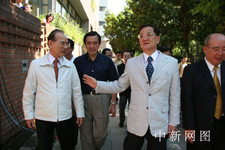 | 7月16日,中國(guó)國(guó)民黨主席選舉在全臺(tái)601個(gè)投票所展開(kāi)。現(xiàn)任國(guó)民黨主席在居家附近的臺(tái)北復(fù)興中小學(xué)參加投票。圖為連戰(zhàn)(右二)在步入學(xué)校前,與國(guó)民黨秘書長(zhǎng)林豐正(左一)交談臺(tái)灣農(nóng)產(chǎn)品登陸問(wèn)題,1號(hào)參選人、臺(tái)北市長(zhǎng)馬英九(中)和國(guó)民黨副主席吳伯雄(右一)陪同。中新社記者 董會(huì)峰