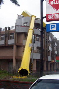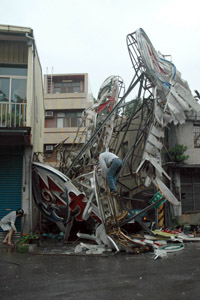 高雄縣橋頭鄉(xiāng)一座大型鐵制廣告廣告牌被強風(fēng)吹倒,壓到對面民宅。