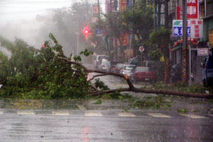 高雄地區(qū)風(fēng)雨交加,路邊樹被拔起,橫阻道路。(臺灣“中央社”圖)