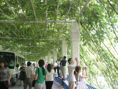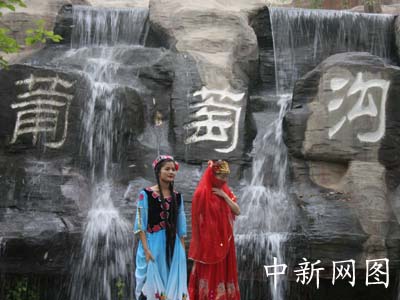 葡萄溝,位于吐魯番縣城東北角,是火焰山西側(cè)的一個(gè)峽谷。車進(jìn)峽谷,只見兩山夾峙,中間是草木芳菲的溝壑,宛如一道綠色的畫廊。吐魯番人在谷底筑了鵝卵石和水泥板砌成的河渠,長(zhǎng)流不息的河水恰似一道銀練從溝底奔騰而下,翻卷著雪白的浪花縱貫二三十里,澆灌著整個(gè)葡萄溝。沿著河水向峽谷深處延伸的那層層疊疊的葡萄田,像一匹匹的翠綠的綢緞,依山勢(shì)直掛在柏油路兩旁的山坡上,其間桑榆桃柳,錯(cuò)落有致;村舍農(nóng)家周圍清流縈回。萬綠叢中,但見衣裙鮮艷的維吾爾少女,三五成群,手挽筐籃,活躍在葡萄園里,使葡萄溝更顯得斑斕多彩。她們的陣陣笑語歡歌,伴隨著潺潺水聲,嚶嚶鳥鳴,好像一支美妙的田園交響曲,令人陶醉留連。盡管此時(shí)火焰山下熱氣蒸騰,熾風(fēng)撲面,天上烘烤,地上烙腳,而葡萄溝里卻清風(fēng)習(xí)習(xí),涼爽宜人,真是風(fēng)光迷人的的避暑勝地。