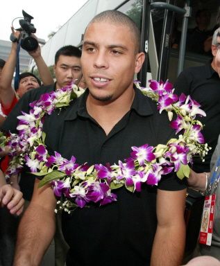 北京時間7月20日凌晨,西甲豪門球隊(duì)皇家馬德里飛抵北京,開始對中國進(jìn)行為期四天的訪問。圖為羅納爾多帶上中國方面獻(xiàn)上的花環(huán)。