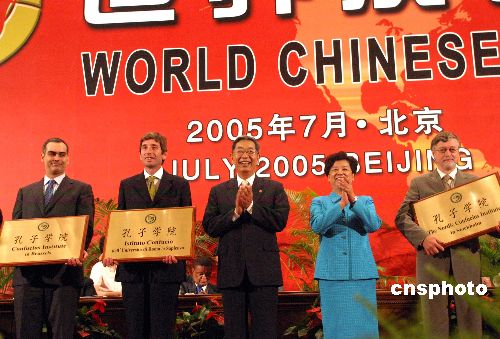 七月二十日,世界漢語大會在北京人民大會堂開幕。來自海內(nèi)外五百余名政要、政府官員、大學校長、著名漢學家和漢語教學工作者,將共同探討“多元文化架構(gòu)下的漢語發(fā)展”。圖為全國人大副委員長許嘉璐、國務委員陳至立為孔子學院授牌。作者:張勤