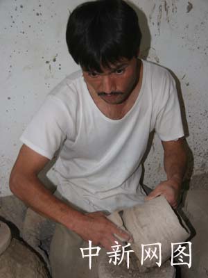 英吉沙縣的土陶藝人伊瑪木·卡烏里正在自家的作坊里精心制作土陶工藝品。