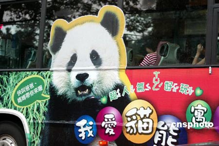 七月二十一日,一輛繪有大熊貓廣告畫的公共汽車在臺(tái)北忠孝東路上行駛。今年五月,大陸決定贈(zèng)送臺(tái)灣大熊貓以來(lái),在臺(tái)北民眾中掀起了大熊貓熱潮。作者:盛佳鵬