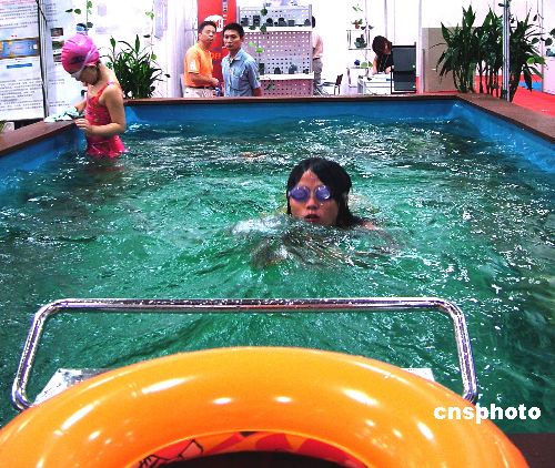 7月21日,在2005中國上海國際環(huán)保工業(yè)展上,最新亮相的“游泳跑步機(jī)”吸引了觀眾注意。這座游泳跑步機(jī)需要2.6M0*5.2M的安裝空間,出水速度可選擇,水凈化設(shè)備可保障池內(nèi)水長期循環(huán)使用。作者:井韋