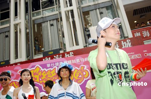 近期在香港熱播的電視劇《我的野蠻奶奶》劇組演員,7月24日在奧海城與觀眾近距離接觸,讓市民一睹眾明星風(fēng)采。圖為飾演奶奶的汪明荃一身搖滾打扮登臺(tái)與觀眾會(huì)面玩游戲派“利是”。