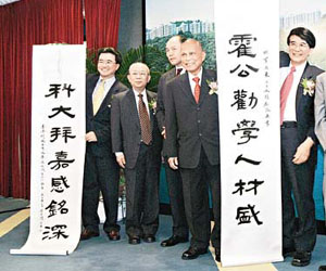 為答謝霍英東的捐贈(zèng),科大今日贈(zèng)送一副對(duì)聯(lián)予霍英東,內(nèi)容為“霍公勸學(xué)人材盛,科大拜嘉感銘深”。朱經(jīng)武說(shuō),稍后會(huì)與科大師生、校友及董事會(huì)商討正式報(bào)答霍英東的形式,不排除采用冠名的方法。完