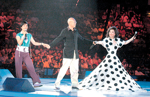 中新網(wǎng)7月27日電 據(jù)香港《大公報(bào)》報(bào)道,第二場(chǎng)“金光燦爛徐小鳳2005演唱會(huì)”上,汪明荃和羅家英拍拖捧場(chǎng),在小鳳姐邀請(qǐng)下,更手拖手上臺(tái)客串,為演唱會(huì)帶起高潮,氣氛熱烈。